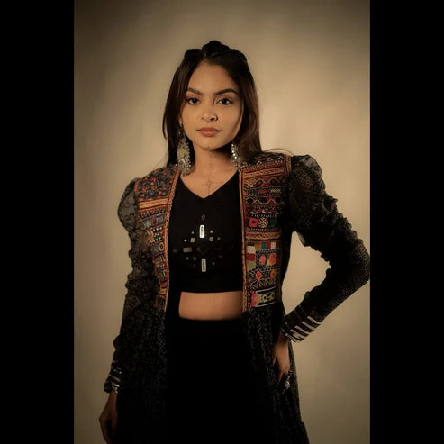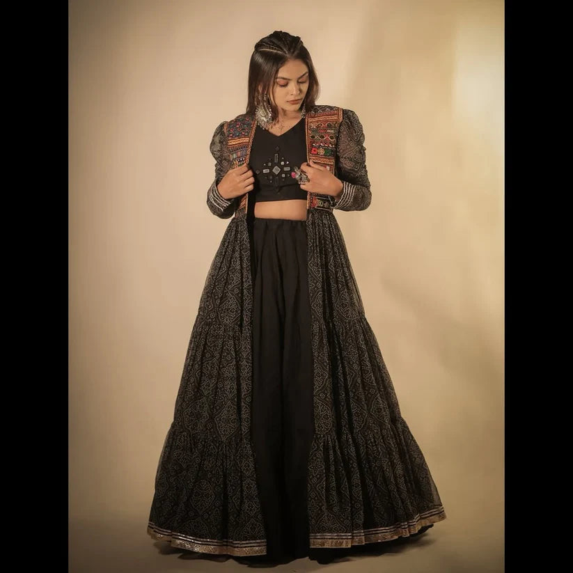 Ruhi Black Bandhani Vibrant Kutchi Shrug Lahenga Set